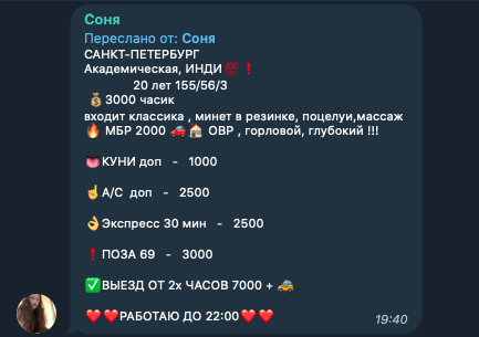 Всех приветствую! Заинтересовала меня как то девушка Соня, территориально находится на Академической, Вавиловых 7. Анкета на РД indi289445. По поиску поискал ее в разных форматах - не нашел. Стоимость 3000час/2500 полчаса, куни доп, МБР с ОВР доп ну и куча других допов.