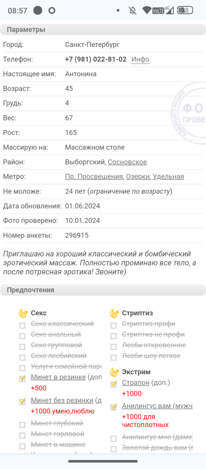 Фото в анкете либо фотошоп или это удачно и давно. Дама выглядит значительно старше и крупнее. В целом веселая такая. Квартира - хороший ремонт начала 2000х, кресла, массажный стол. Средств обработки в ванной нет вообще.
