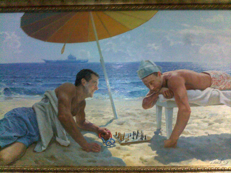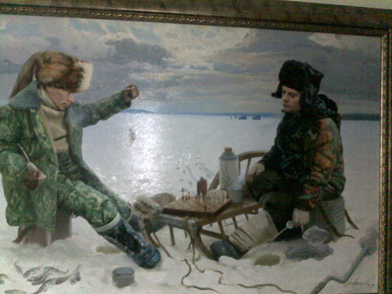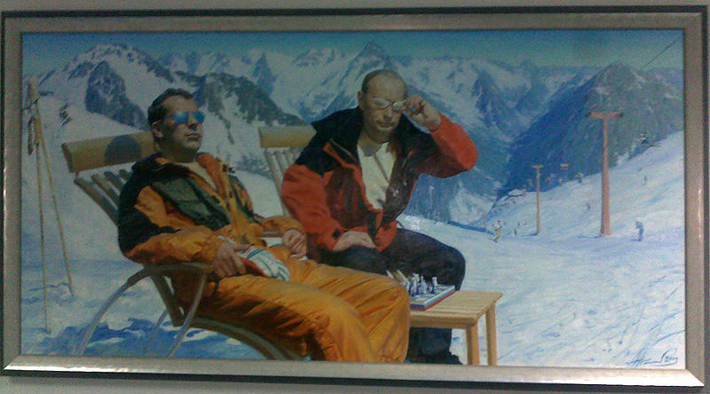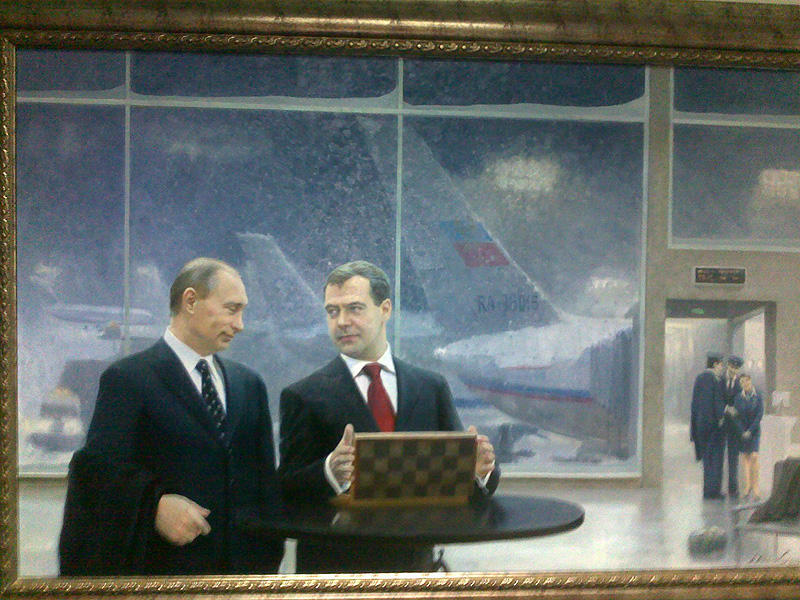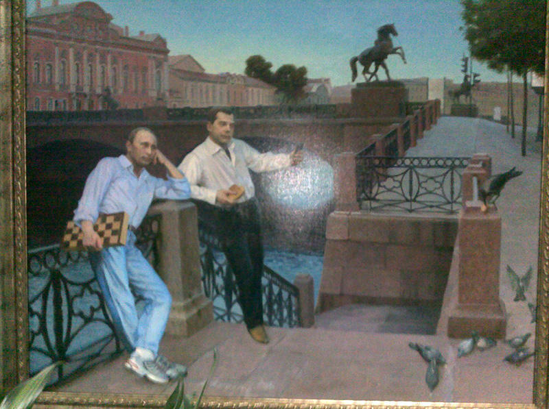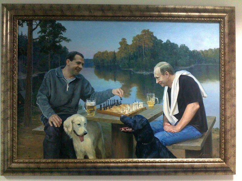 Интересно мнение психиатра по поводу автора этих картин. Нахера везде шахматы? Почему Медведев играет первый черными, а ВВП уже почти допил бокал пивасика? Откуда художнику было знать, что Медведеву Айфон4 подарят (на последней фотке явно виден)?