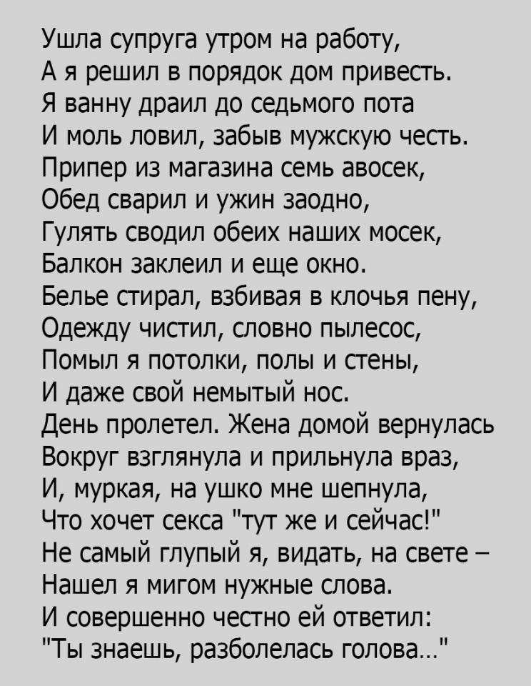 Муж: — Говорят, наш новый сосед тот ещё Казанова. Вроде бы в нашем доме он только с одной женщиной не переспал.