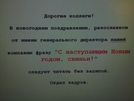 В новогоднем поздравлении, разосланном от имени генерального директора нашей компании фразу "С наступающим Новым годом, свиньи!" следует читать без запятой.