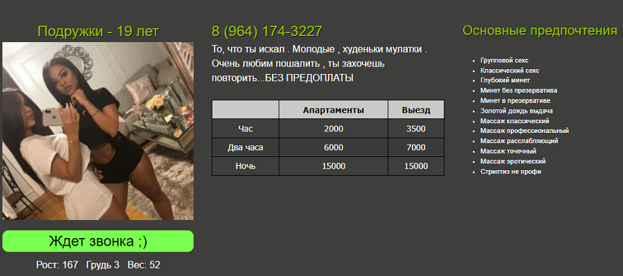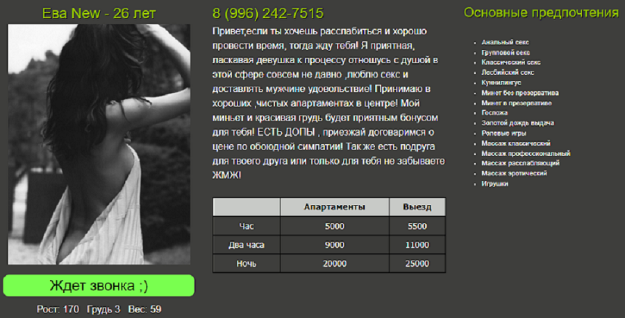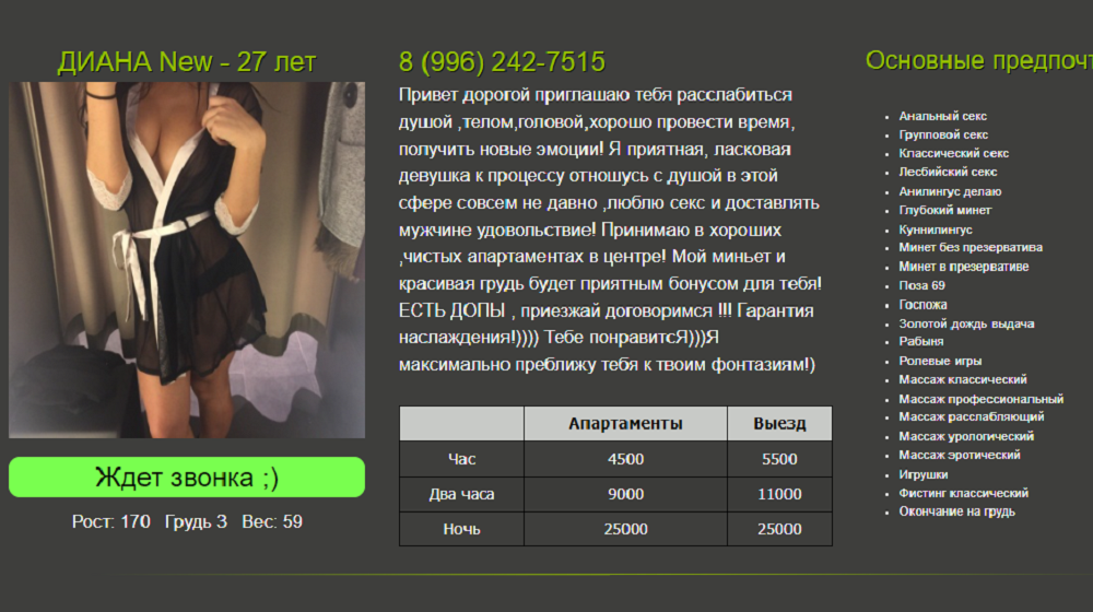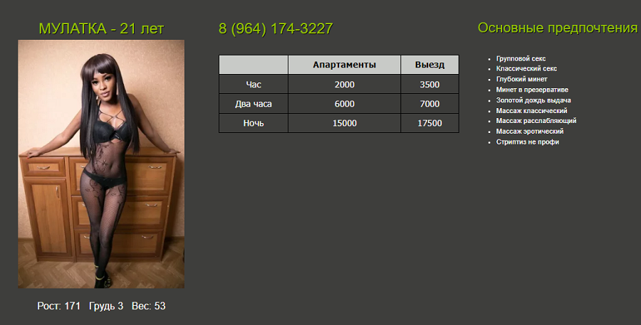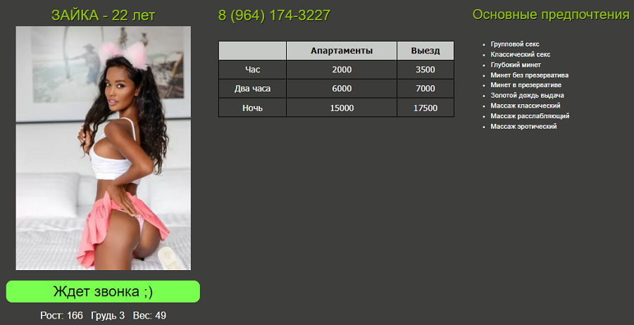 Хм, интересненько. Я был у нее до того как лег сайт, разговорились, обещал написать отзыв. Бац, а сайт не работает. Буквально несколько дней назад позвонил ей, была в Костроме, говорю как приедешь, поставишь анкету, маякни, Я отзыв напишу, чтобы народ пошел. Забыла, хотя жаловалась, что народ не идёт. Ладно, мы люди не гордые. И так. Принимает, видимо, также на Толбухина,6. Квартира и место имения норм. По ТТХ. Вообще-то в халате она как раз сойдёт за оригинал ибо сиськи пушка, плотные, стоячие, размер тоже, что надо. Сама вроде родом с Кавказа, но не похожа. На лицо симпатичная(ну не прям вау, но для кого-то может), рост около 1,70 м., волосы такие плотные, крашеные, смоляные. Если закончить со внешностью, то норм, если бы не растяжки на животе и попе, но они не сильно критичные. Попа ещё неупругая. Встречала в боди, не видно, а потом было пох