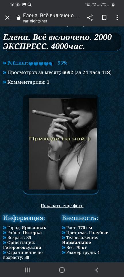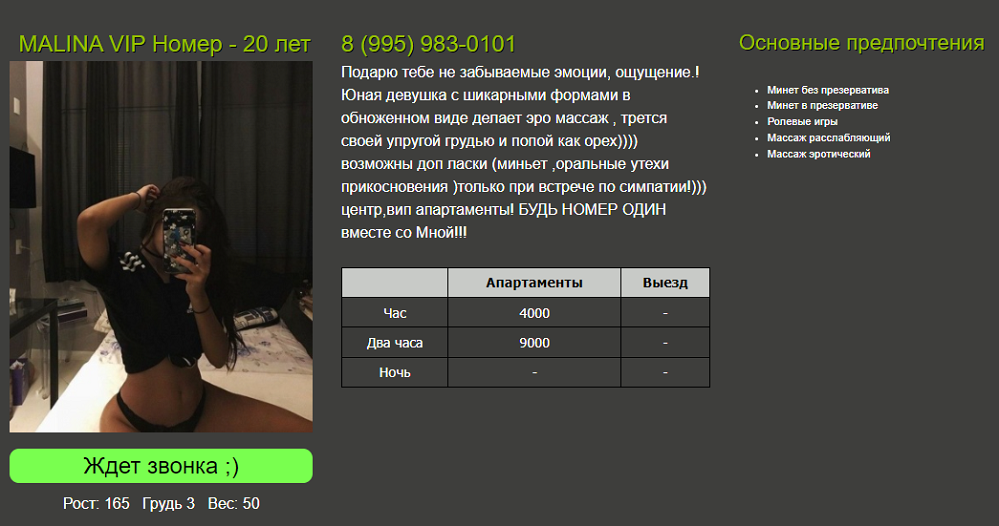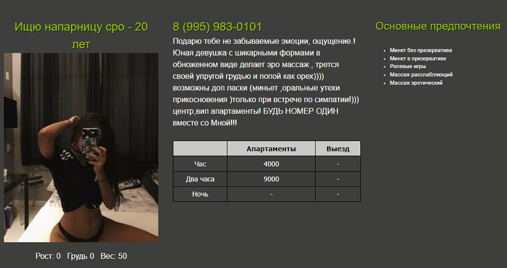 Я бы по такому описанию в анкете не пошел. "Апартаменты, выезд". Ну что это такое, вы кроме картинок из интернета вообще ничего не замечаете? Это мамка судя по всему, либо стремная пропитуха. В общем аналитически анкета полная хрень. Могли бы для начала просто позвонить, спросить.
