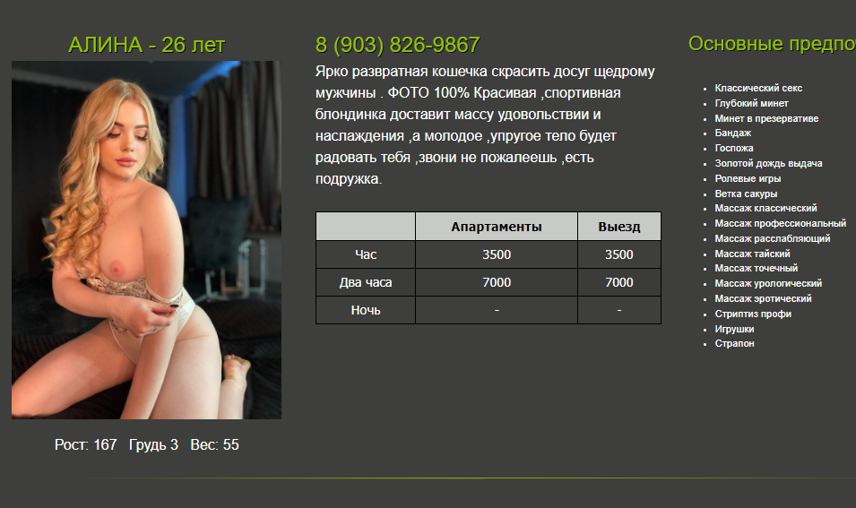 Договорились что наберу по видео связи в телеге. Боялась что кавказец или ещё что-то. Пообщались себя девушка не показала, но я что-то тупанул и не попросил об этом. Голос очень приятный у нее мне кажется действительно около 20 лет. Фотки сказала типаж. Уже хотел к ней ехать, но мне позвонил бесплатный вариант и я решил ее оставить на другой раз... Может кто-то был или планирует?) Напишите что и как. В особенности личико и попа волнует))) по цене 4500 она говорит классика