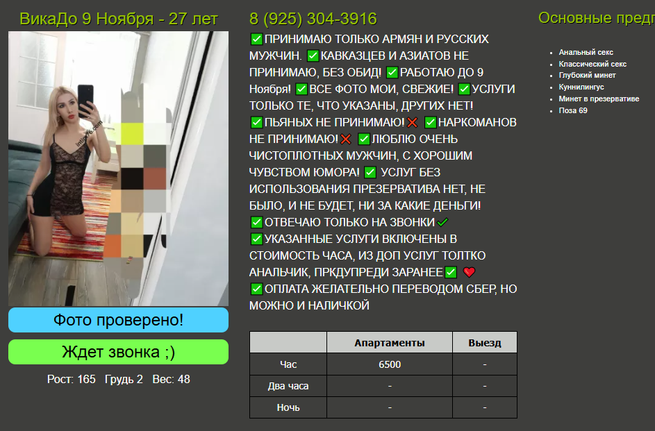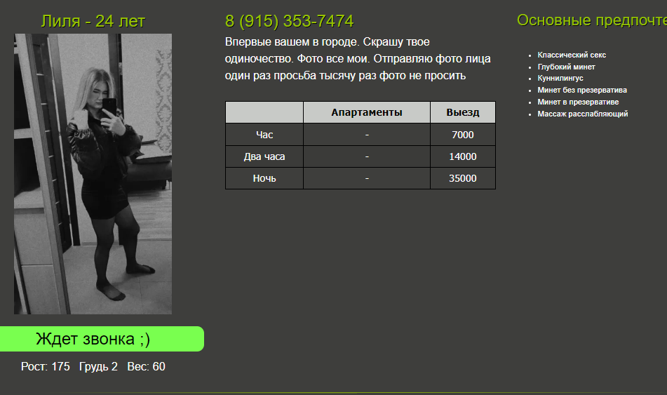 , так вот представьте, что вы занимаетесь ремонтом стиральных машин. Вы, как нормальный адекватный человек, сделали бы описание к своей анкете? Риторический вопрос), фото с высокой долей вероятности не ее. Опять же с высокой долей вероятности подмосковная гастролерша, берущая у себя максимум 6к.