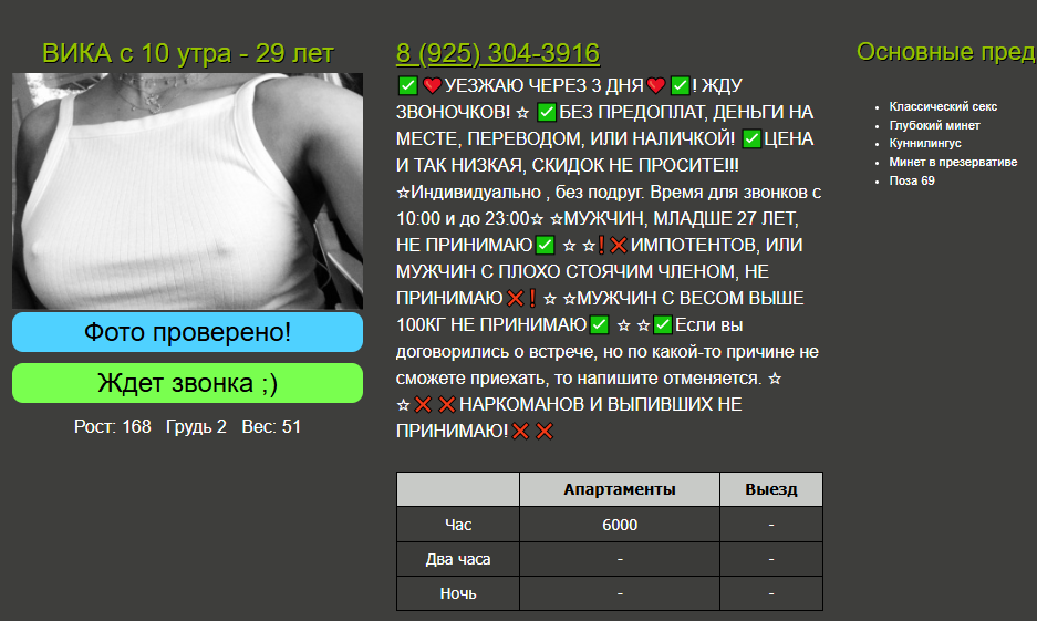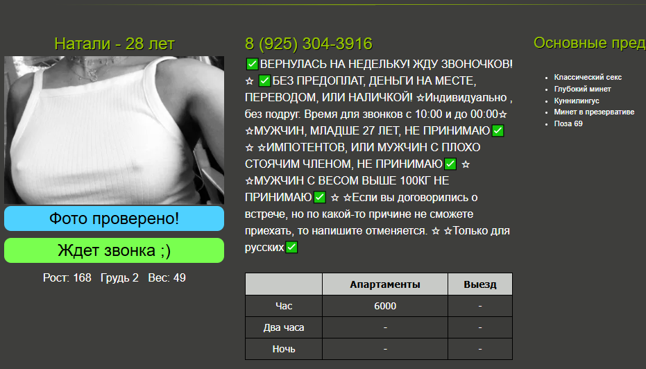 Полине 25 лет - 915-967-80-97 набирал недавно, встреча не состоялась, сказала, что сегодня уже не может, принимает не больше двух клиентов за день, встречается в своё удовольствие нечасто и всё такое. Чешет сексуально как по написанному ( привстал даже как в вашем случае ) ещё раз звонить не пробовал , или её анкеты нет или мне не как. Хорошо если это она сама по телефону так общается но сомнения появились, что диспетчерша . Раньше у массажисток диспетчерша похоже сексуально общалась если не мёртвого то полудохлого точно уболтала бы.