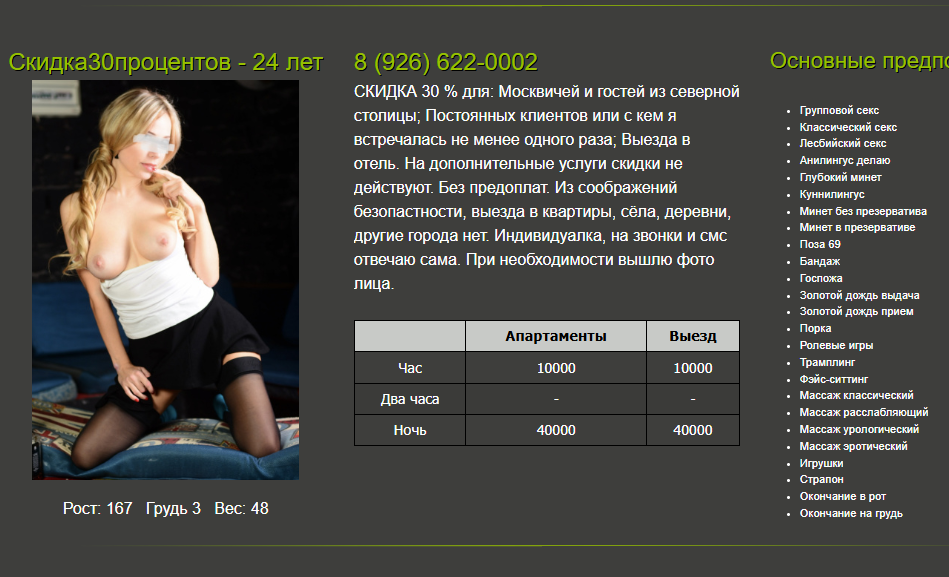 Когда крайний раз у нее были? Или может кто был у нее недавно сможет прояснить такой момент: не знаю на сколько правда или нет, но под одной из анкет видел комментарий (который впоследствии был удален или создана новая анкета) про то, что якобы она только собирает инфу о клиентах (непонятно для каких целей), а реальных встреч нет. Что думаете по этому поводу?