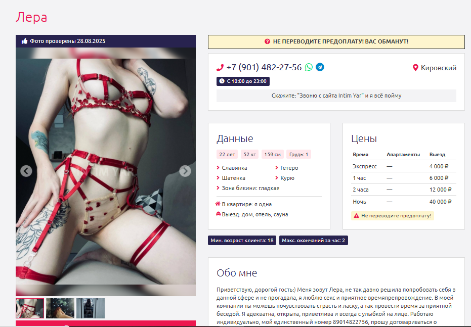Не попадалась не видел ещё этой анкеты. На ИнтимЯр что то давно не заходил, там последнее время всё анкеты левые с дикими ценами, старьё и прочее виртуально говно с ценником до 150 тысяч. Спасибо, может схожу к Лере этой, надо будет только с местом заморочится.