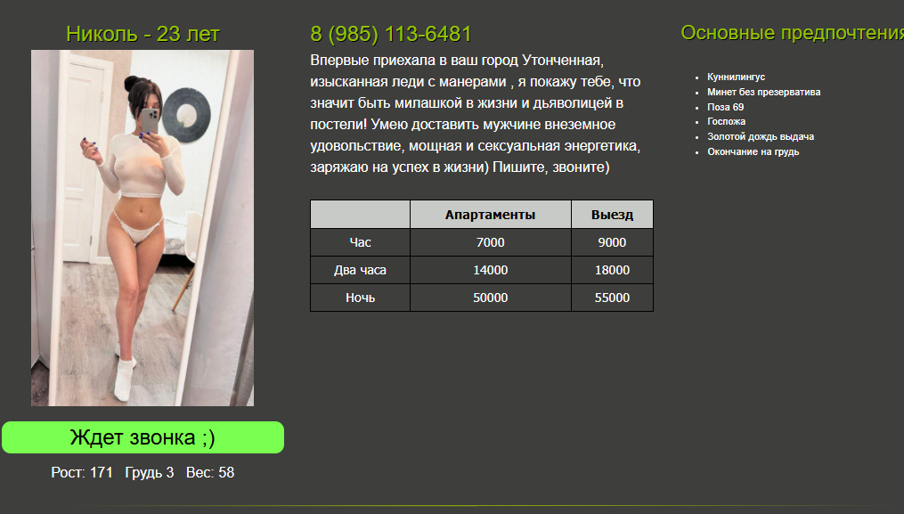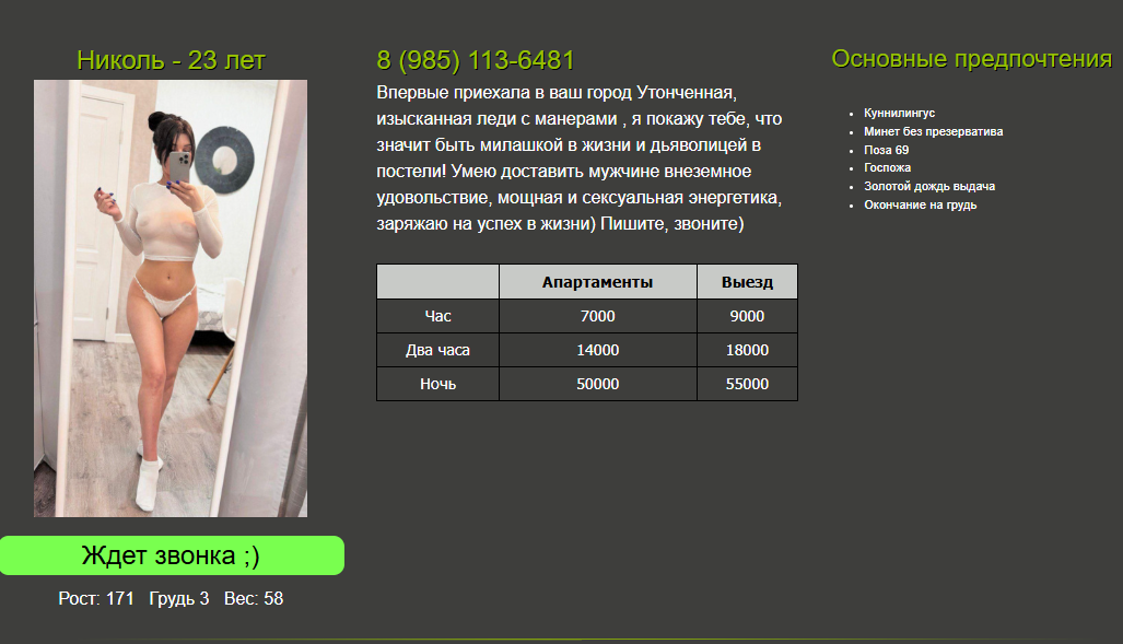 . Прошмыгнул, поднялся на этаж, встречает. Фотки не ее, я повелся на фигуру, а там явные несоответствия. Возраст 35-36, рост 170, грудь 3 подвисает, вес 60, есть животик, стремные не свежие татухи (опять же, на фото их нет), плюс-минус худая мягкая попа. Если честно, я таких девушек называю «бесформенные», пропорции тела очень странные, не красивые. На лицо не крокодил, пахнет приятно, молодец.