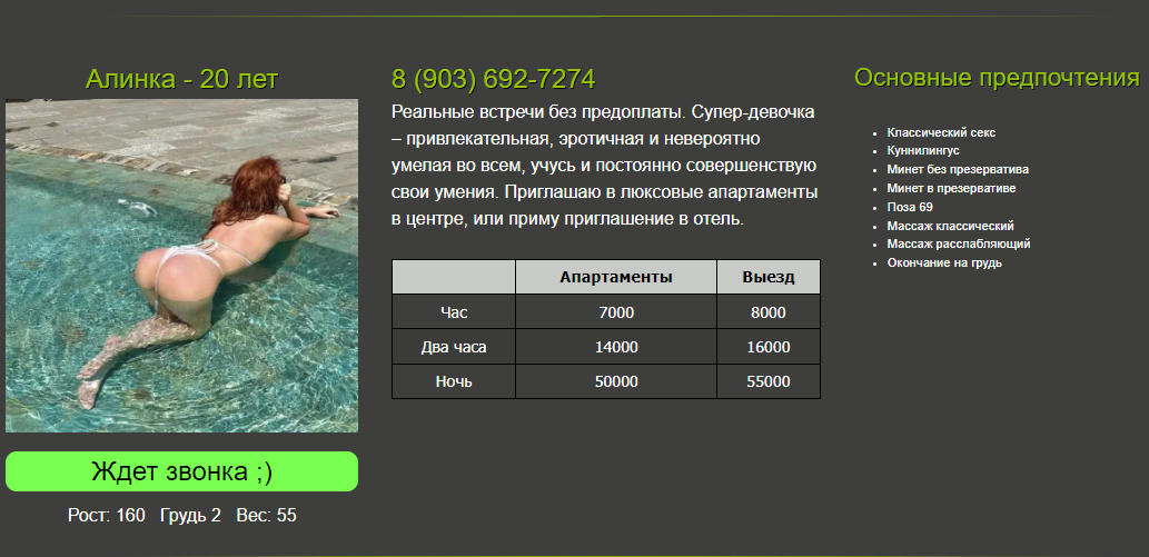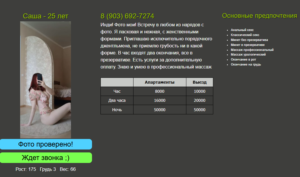 Принимает на Республиканская, 6, быстро договорился, приехал. Вот что увидел: фото ее, но наверное, не очень свежие, придираться не хочется, встретила в секси платьице красном, красивая девушка восточной внешности. Очень приятный голос, есть много мелких татух на руках и груди. Очень контактная, не ушлая, нежная, в общем максимально приятная! Возраст я думаю около 26-27, грудь приятная 1.5-2, рост 170, в целом