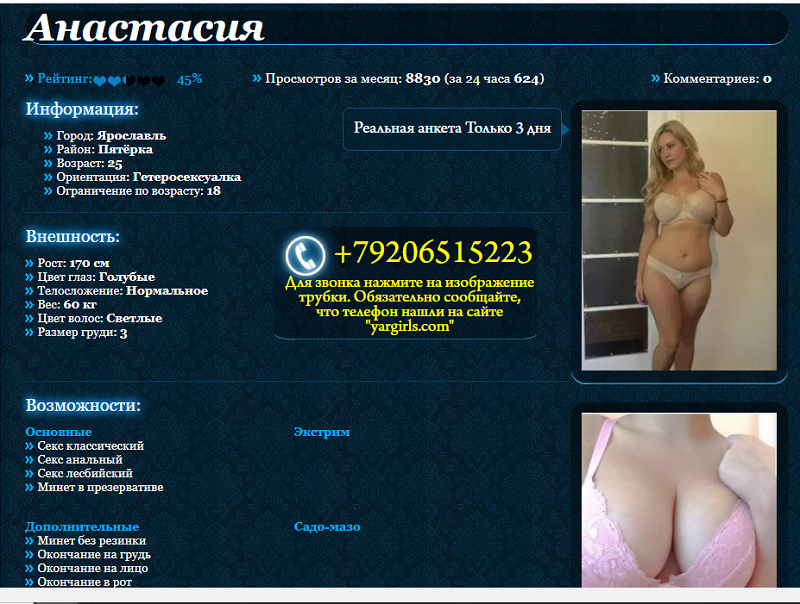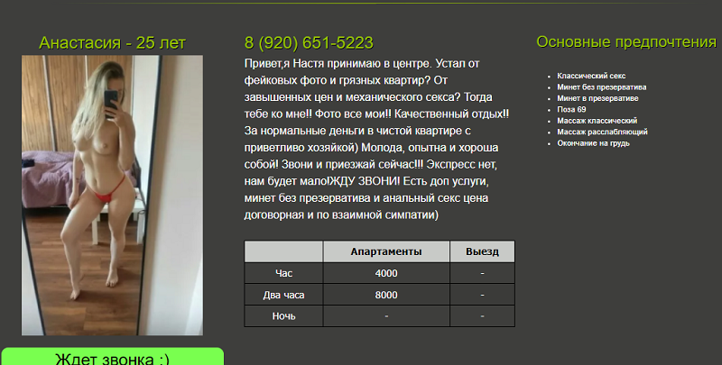 Фото в анкетах постоянно меняет и пишет фото мои, чушь нет не одной её реальной фотографии. Светловолосая, лицо обычное. Не общительная и мало разговорчивая, среднего роста, полноватая, живот есть, за фигурой не очень следит, грудь не плохая, упругая. Если в бытовом сервисе вроде не плохо, то в интимном полный "0". Допов нет, миня в презике дилетантский какой то, одно поверхностное мусольканье. И КС не лучше калибр средний, смазка своя и использует, эмоций ни каких. Тупая долбёжка, кукла из той анкеты наверно поактивней будет. В общем закончил, сполоснулся и ушёл, она по моему была рада, столь быстрому завершению процесса. А в анкетах чего понаписано, всё херня. И сравнивать, говорите Алина не стОит 4000 руб. , то эта тогда сколько стоит ? Откуда она такую цену на свои услуги наковыряла?