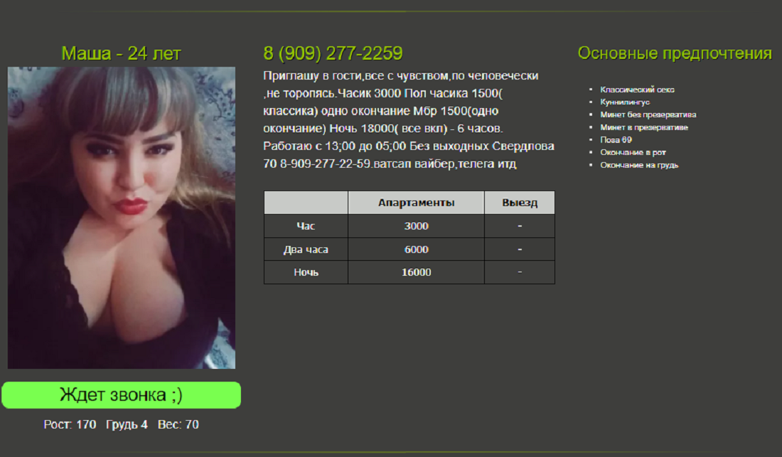 Добрый вече уважаемые Доны и свободные читатели! Третий раз пишу отчёт, потому что первые два куда то делись, но я обещал отчет по этой особе, Алиса, Лиза , Софи, имен много, а толку мало, ну все по порядку. Был я у неё перед самым новым годом 21, ценник был у неё 6к, но был и экспресс за 3, вот на него то я и пошел. Пошел из за любопытства, во первых написала что фото её хотел проверить, лицо не скрывала на фото и второе, молодость, пожалуй самая молодая фея на тот момент. Дозвонился с первого раза, голос действительно молодой, назвала адрес в районе Ярославля главного, приехал, звоню, открывает блин, дитё, рост метр с кепкой, во рту брекеты, глазки зеленые опустила, фотки её,унал сразу. Здравствуйте, проходите. И тут меня накрыло сомнениями, а может ну её на фиг? Чё то молодая сильно. Еще раз посмотрел, оценил, сиськи такие к трёхе, бедра, жопа, ну не детские, лицо моложавое видно что молодая и рост примерно 1.5 может из за этого кажется такой. Ну уже пришел, да и любопытство. Вообщем сходил в душ, приступили, бляяяя, а она ноль, минет ноль, поелозила своими брекетами, думаю хер с ним, давай секс, а там и секс такой же,- так не удобно, глубоко больно. Думаю, а что с тобой час можно делать? Хорошо экспресс взял, я бы себе не простил. А теперь уважаемые Доны вопрос от куда б...ть такой ценник взялся? От куда такие отзывы? Да ты хоть кино посмотри как это делается! Ты залепила ценник как у элитной проститутки, (а с нового года он стал ещё выше) а сама бревно, пусть даже молодое но бревно.... Мы её перепутали с наркоманкой, честно говоря фотки похожи на неё, да и предпосылки были( почитайте про неё, есть ссылки). Хорошо что не она. зла ей не желаю, просто выбрала себе дорогу, будь профи, или желания свои остуди. Как говорят комуняки, "КАЖДОМУ ПО СПОСОБНОСТЯМ, КАЖДОМУ ПО ТРУДУ" Да это не только этой девочки касается...Уже обсуждалось тут и не раз ценники, та же Алина я к ней за две тысячи ходил уже четыре, Лена была три, ну не было случая что бы не дозвонился, всегда свободна, смотрю уже четыре, вот из за принципа не пойду, добавьте услуг тогда, какие нибудь комбо придумайте. Одна у нас утеха, Василиса! Вот умничка радует нас своим постоянством. Кто там говорит что у неё сиськи двойка пусть не врут!!! Сиськи у неё 3+ ближе к четырем!