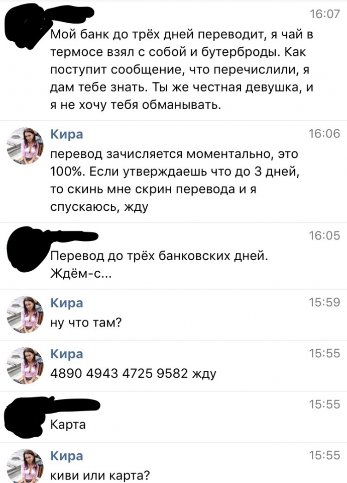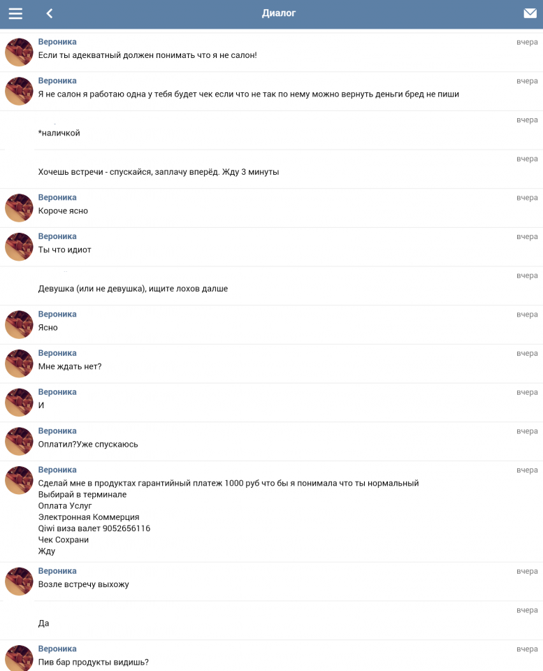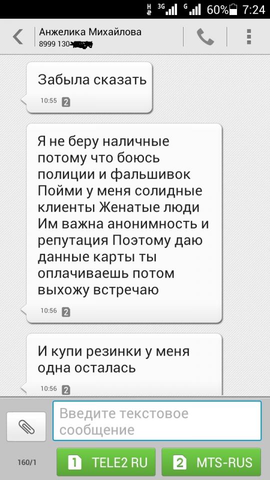 Её первое сообщение: Здравствуй. Пришли фото свое пожалуйста. Я приехала с города Волгограда в Командировку сюда на месяц. После пары моих ответов пришло: Я брала обещанный платеж на Волгоградской симке у меня сейчас минус 230...если имеется возможность положи мне пожалуйста. А вот на мое письмо: Давайте я при встрече Вам новую симку подарю? ответа не последовало