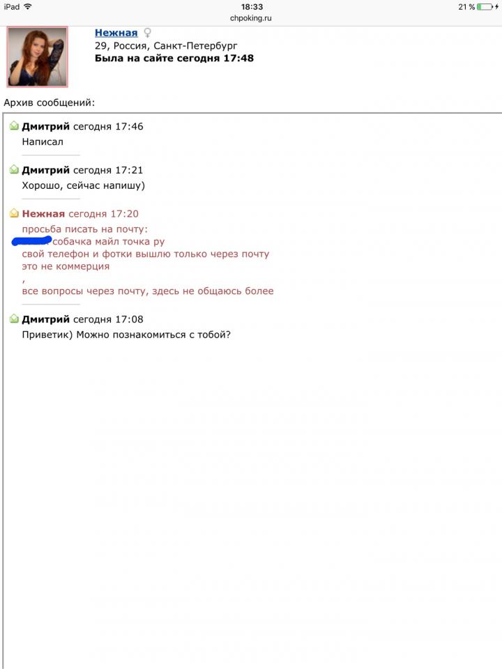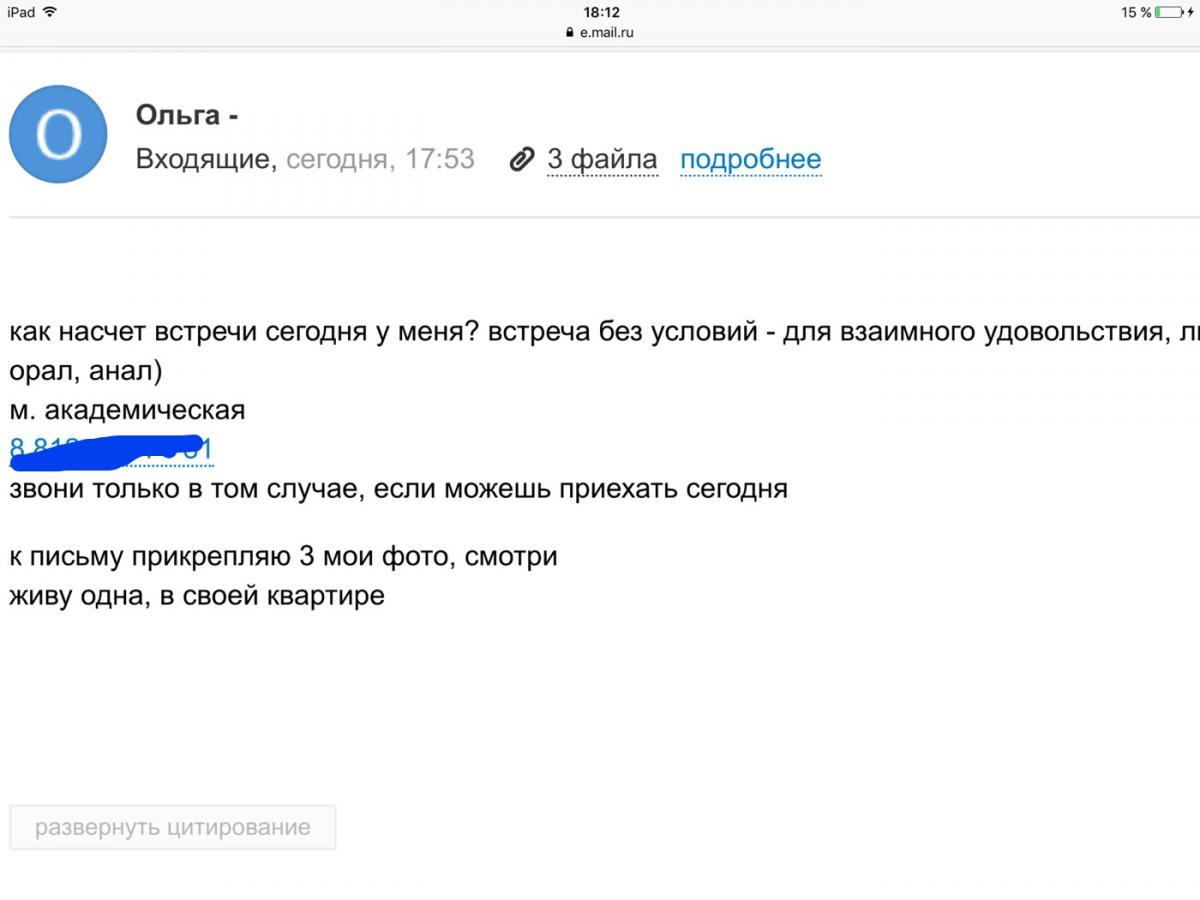 Написала на чпокинге свой эмэйл первым сообщением и закончила там переписку, написал на мыло и она предложила встречу бесплатно, и даже не попросила мои фотографии. Сказал "жду сегодня", а если сейчас не могу, то звонить ей вечером после 15:00 суббота, четверг. С одной стороны сладкий вкус халявы и желание приятно провести время с красивой фёклей, но что-то меня настораживает (всё) . Сколько сижу на разных сайтах и за много лет такого ни разу не было. Представилась Ольгой с Академки, фото и её сообщение скрином прикрепил. Фото показались какими-то знакомыми, да и сомнений море. Подскажите товарищи, мб кто имел дело с этим экземпляром.