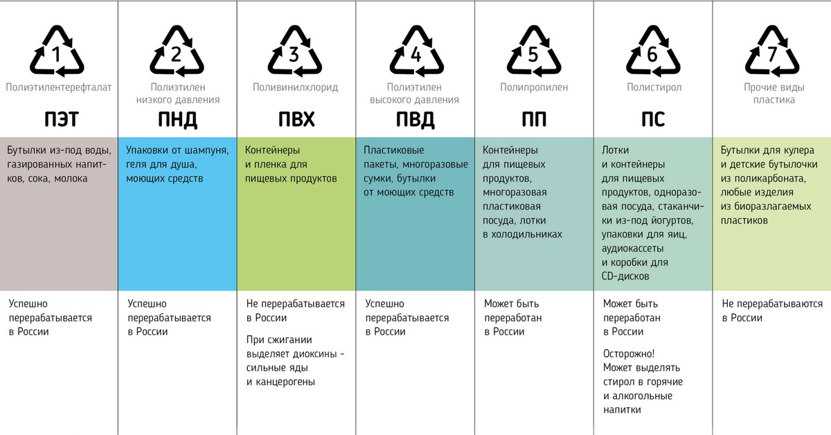 Цифры от 1 до 7 обозначают семь основных типов пластика, которые нельзя перерабатывать вместе — у них разные температуры плавления, разный химический состав. Смешаешь их и получишь брак.