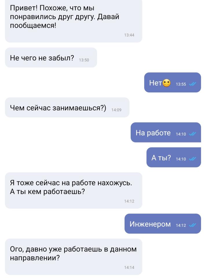 Отличительные особенности бота - всегда сам начинает диалог и выдает вот такого рода ответы стабильно через 1-2 минуты. На первый взгляд может и логичные, но учитывая что по-идее собеседник девушка, такие ответы - это полный нонсенс. Ну особенно последний звучит машинно.