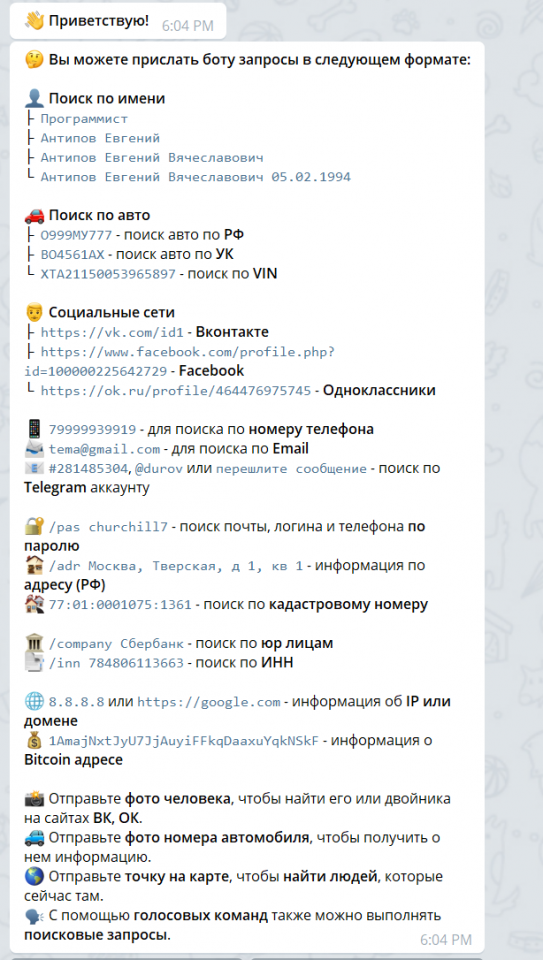 а можешь дать название бота - я нашел какой то, но там интим фото по vk, instagram, аккаунт телеграм или номеру телефона - разводняком попахивает. И какую инфу он выдает?