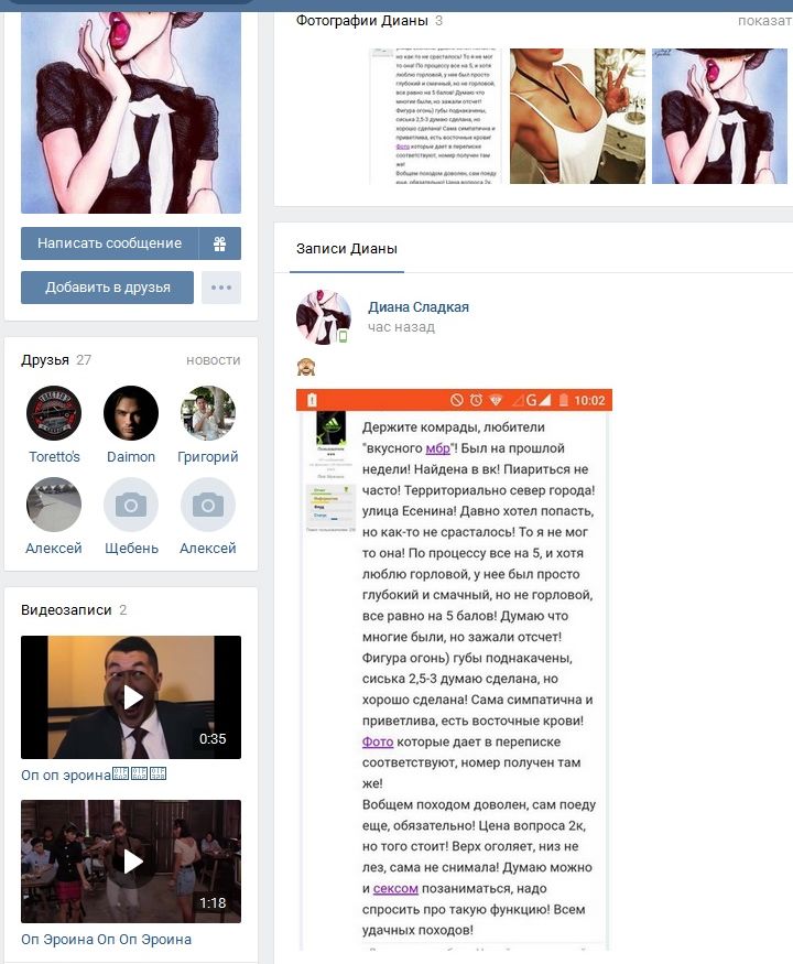 "Приятная новость!!! Сочный ДВОЙНОЙ МБР, ЖМЖ и многое другое... с Дианой(с есенина).. кто был, тот знает , о ком я пишу))) но это в планах) Диана с ас))) мы уже опытны в таких встречах) картинки для инфы, но по любому будет лучше) и не просто жмж, а с элементами ласкания в обе стороны)"
