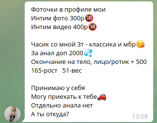 Модификация развода на предплату. Пару лет назад на СЗ мне одно писало: давай встретимся, хочу ЭТО под кино, вот ссылка на кинотеатр для двоих. По ссылке одностраничный сайт, с фотками, адресом, схемой проезда и фишинговой формой онлайн платежей. Т.е. у лоха не только "оплату" получат, но все реквизиты его карты. В другой раз все то же самое, только в качестве места встречи фигурировала квартира-студия БДСМ с полным антуражем на фото. В ответ на равнозначную альтернативу начинали люто агриться. Может, в этом конкретном случае и исключение, но я бы не стал рисковать.