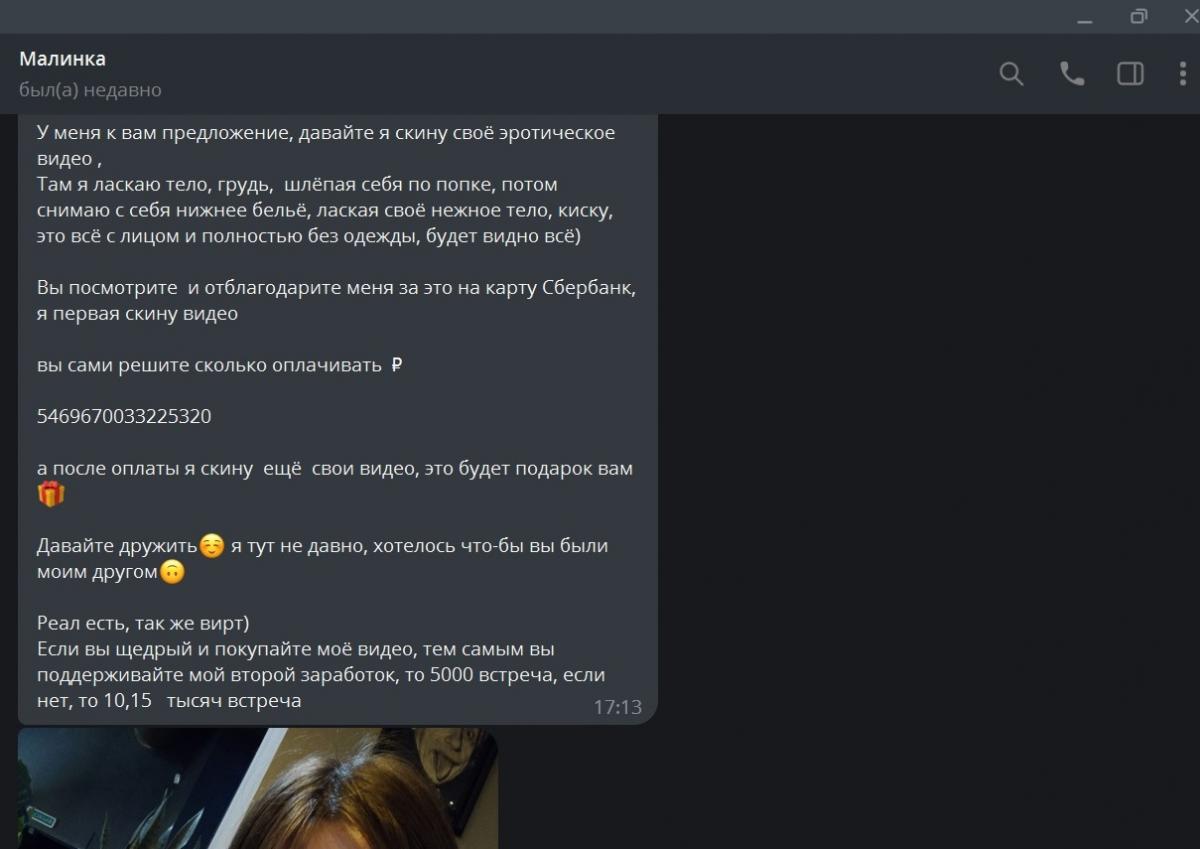 В переписке присылает голосовуххи, с ломаным итальянским, далее говорит на хорошем русском, спросила из какого города, сказала, кто я по национальности, в общем затем затребовала предоплату, в боте "глаз бога" на этом аккаунте и там так же был номер мобильного - и там и там низкий соц. рейтинг + комменты, что мошенник. Будьте осторожнее!