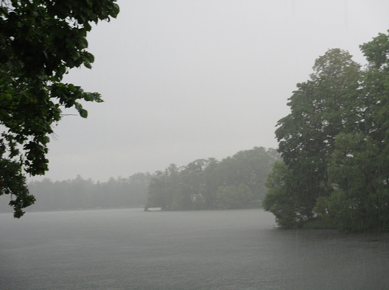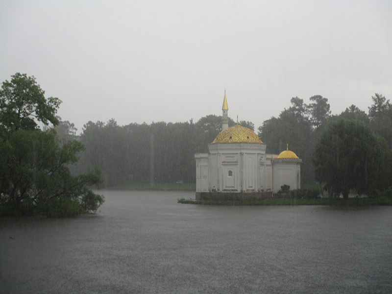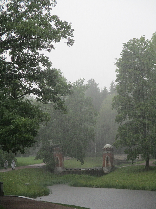 Попал под кошмарный ливень с грозой, и вообще почти всё время дождь шёл. Сцуко, это тенденция уже — как ненастье, так ебацца.