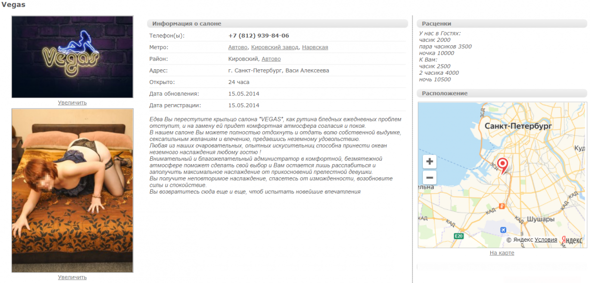 2. Реклама на сайте досуга от 2014 года. При этом было указано, что салон периодически накрывают, несмотря на то, что он имеется на досуге.