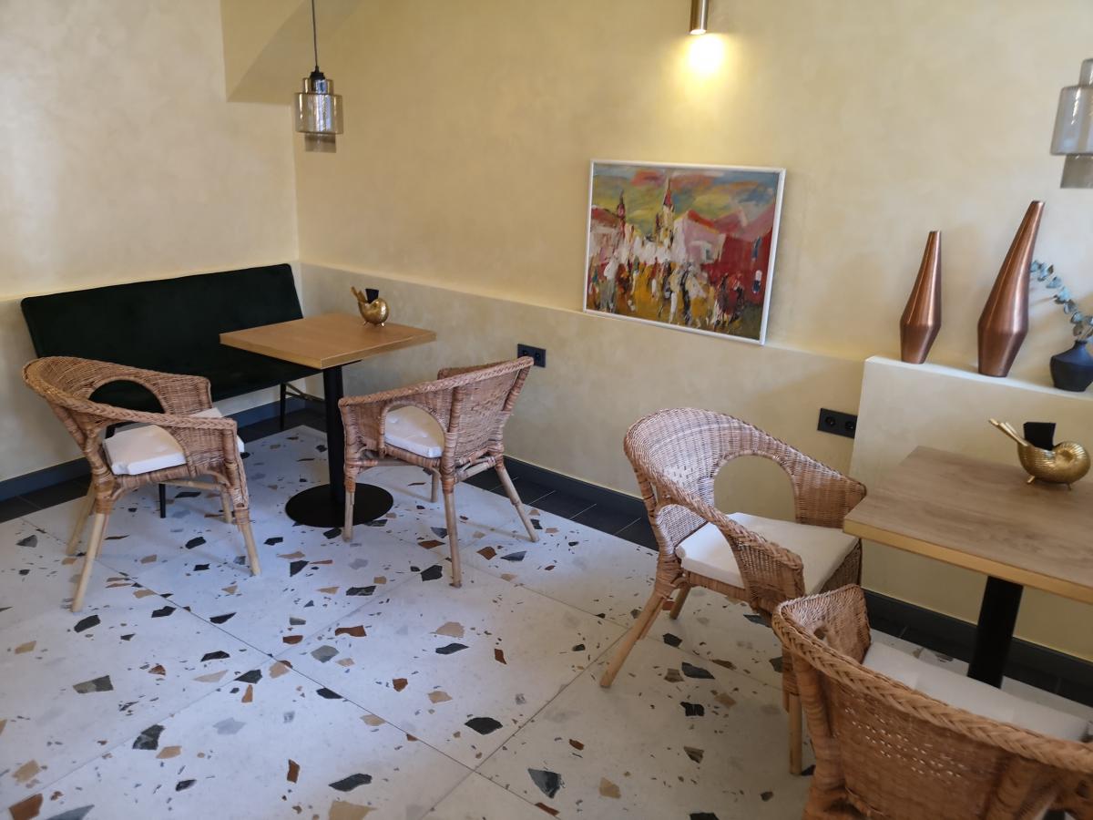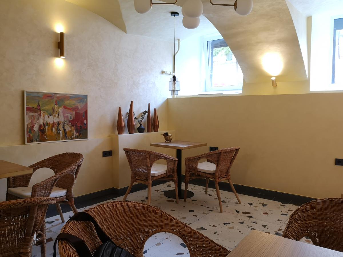 Небольшое помещение на 3 столика, все завешанное картинами и заставленное сувенирами. Интерьер приятный, явно чувствуется женский вкус в оформлении.