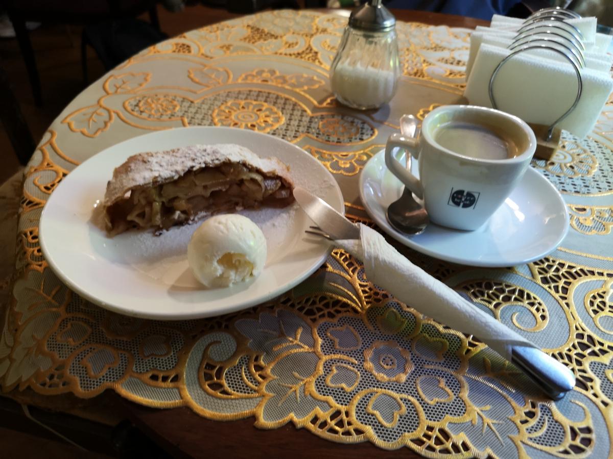 Взял американо и яблочный штрудель. По словам одной из сотрудниц, штрудель она пекла в этот же день. Подтверждаю - штрудель был очень свежий и вкусный. Подают с шариком мороженого, мороженое обычное. Отмечу, что в отзывах на Трипадвизоре больше всего хвалят именно штрудели.