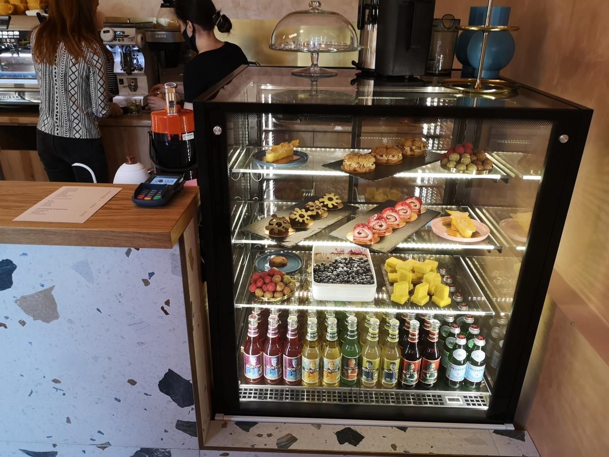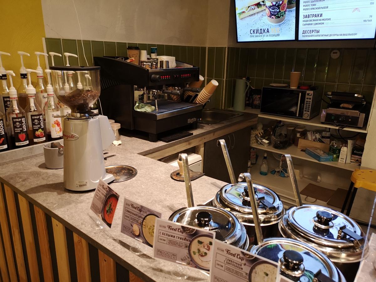 В то же время имеется большая кофемашина (марку не рассмотрел), печь для выпечки круассанов и неплохой ассортимент закусок.