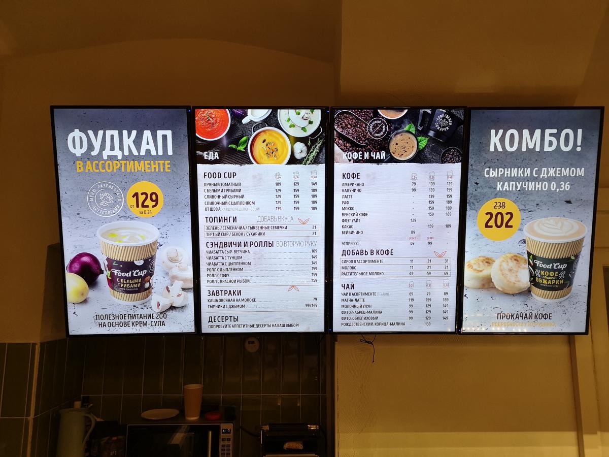 В меню было 4 супа (наливают в такие же стаканы, как кофе), разные виды сэндвичей (в бумаге), кофемашина и несколько видов десертов (обычных).