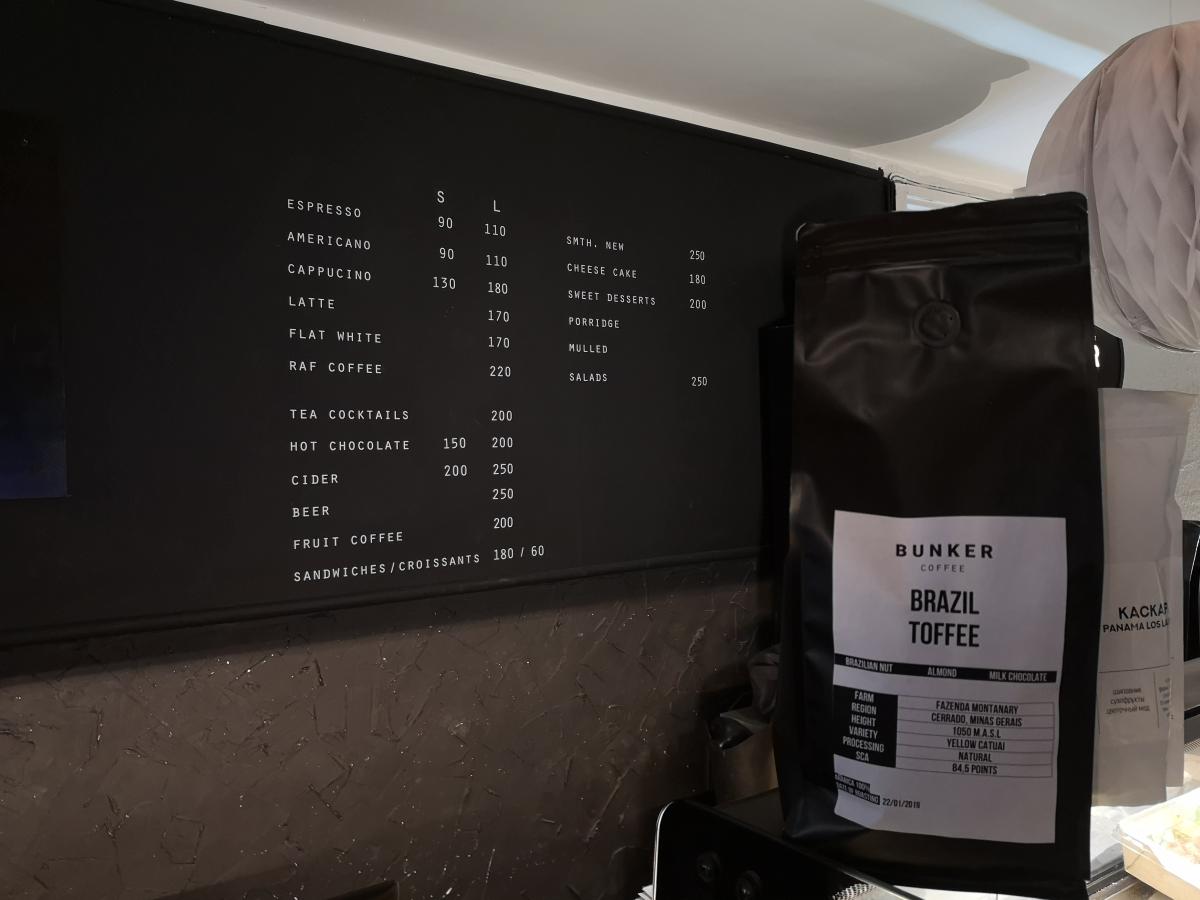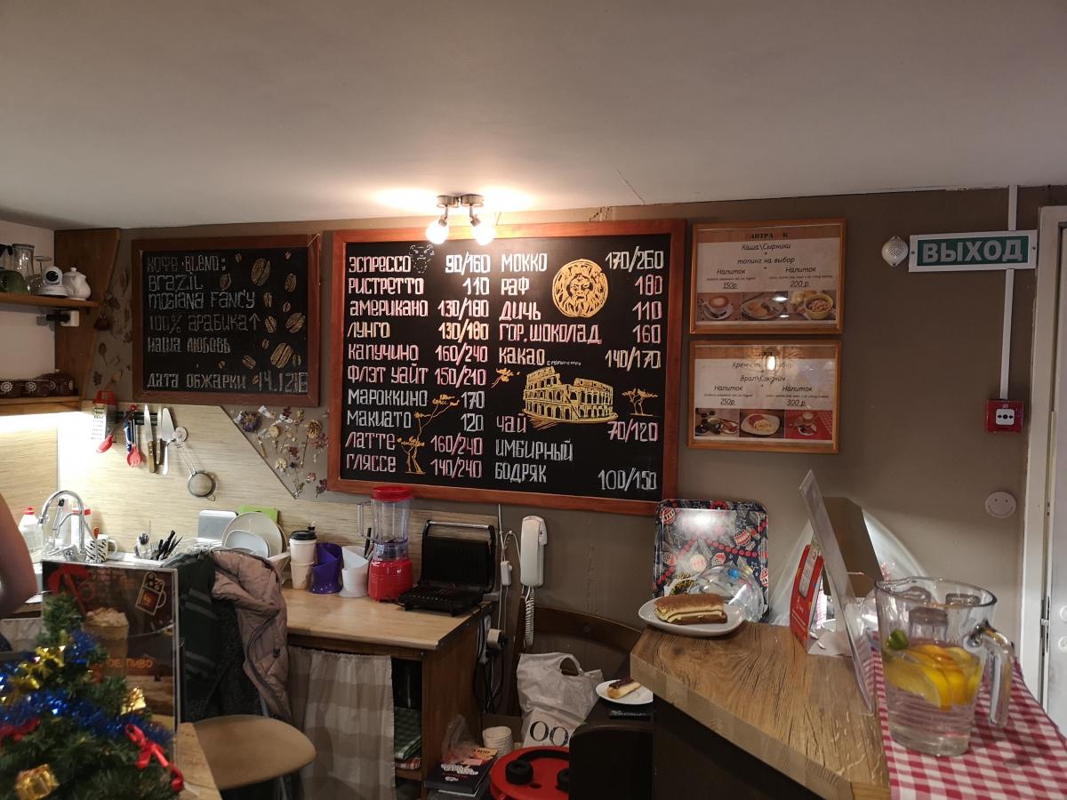 Кофе - бразильская арабика средней обжарки, причем мешок выставлен на прилавок (но название плантации я не запомнил). На прилавке также присутствовал кувшин с водой. Кухни нет (как обычно в кофейнях), есть сэндвичи и сладкие вкусняшки. Взял суфле, понравилось.