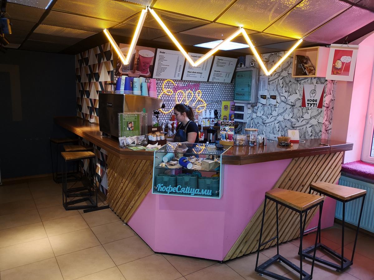 Небольшой лоток у входа в здание. Имеется стойка с 5 табуретками. Конечно, все заточено на вынос - бумажные стаканчики и т.п.