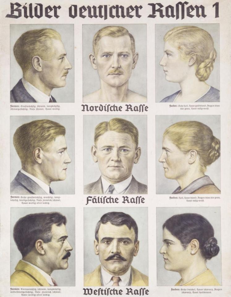 Фото сделаны после летнего отдыха, сейчас кожа у неё бледная. Лицом очень сильно напомнила темноволосую девушку в правом нижнем углу приложенной картинки. Для не владеющих языком поясню: на ней приведены наиболее часто встречающиеся у немцев типажи. Возраст, думаю, ближе к 30, чувствуется по общению.