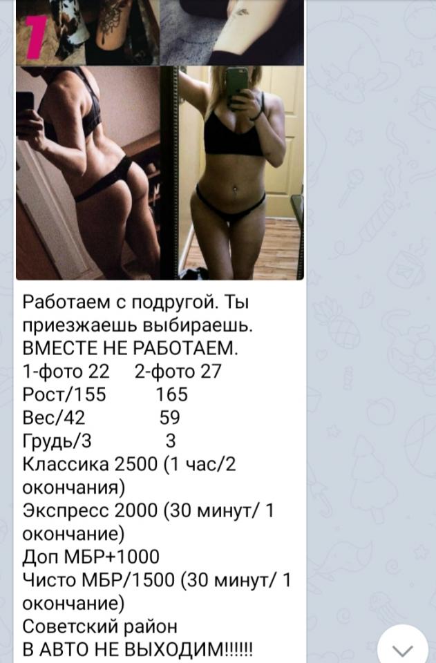 Всем привет) Хотел поделиться своим впечатлением от опыта на прошлой неделе. Возраст - 27 , рост 165 , вес 59,грудь 3 .Имя - хз, вроде ната . Классика +мбрв резине 2500 , советский район . Характеристики - вроде схожи,кроме одного- девушка показалась худая ( ближе к анароксичке ) Много татух( но мне нравятся) Однажды захотелось сходить так как уже гудели яй..а . Вписался в телеге в группе бл..д и похо..ь Договорился и был немножко удивлён, потом желание вообще отпало . Квартира находится на Володарского ( район советский типо ) Встретила меня рыжая миниатюрная девушка которая с миловидном лицом грузинской национальности вроде . Квартира убитая ,пахнет не понятно каким запахом, в мусоре трусы прокладки. Уже хотел бежать но думаю я же пришел получить удовольствие , а не женится .Но думаю : вы работаете с подружкой, неужели нельзя сделать чистоту в квартире ? По процессу был недоволен так как : сверху не надо тут болит, за грудь не надо тут тоде болит . Думаю ладно сзади как понеслась и тут тоде нюансы : вставай в определённую позу. Обильно использует смазкой . Короче : советовать не буду так как наверно есть другие лучшие э варианты. Вторую палку закинул просто получая себе кое как удовольствие. P .s подружку не взял так как типо была занята , а мне очень хотелось. Вообще был настроен на