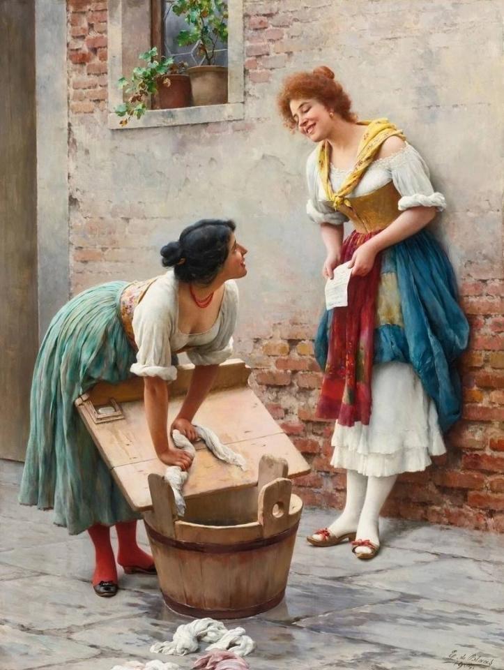 Одна из девушек держит в руках письмо, которое явно её обрадовало. Скорее всего это письмо от поклонника или возлюбленного. Содержание письма всколыхнуло чувства красавицы и она поспешила на улицу, чтобы поделиться радостью с подругой.