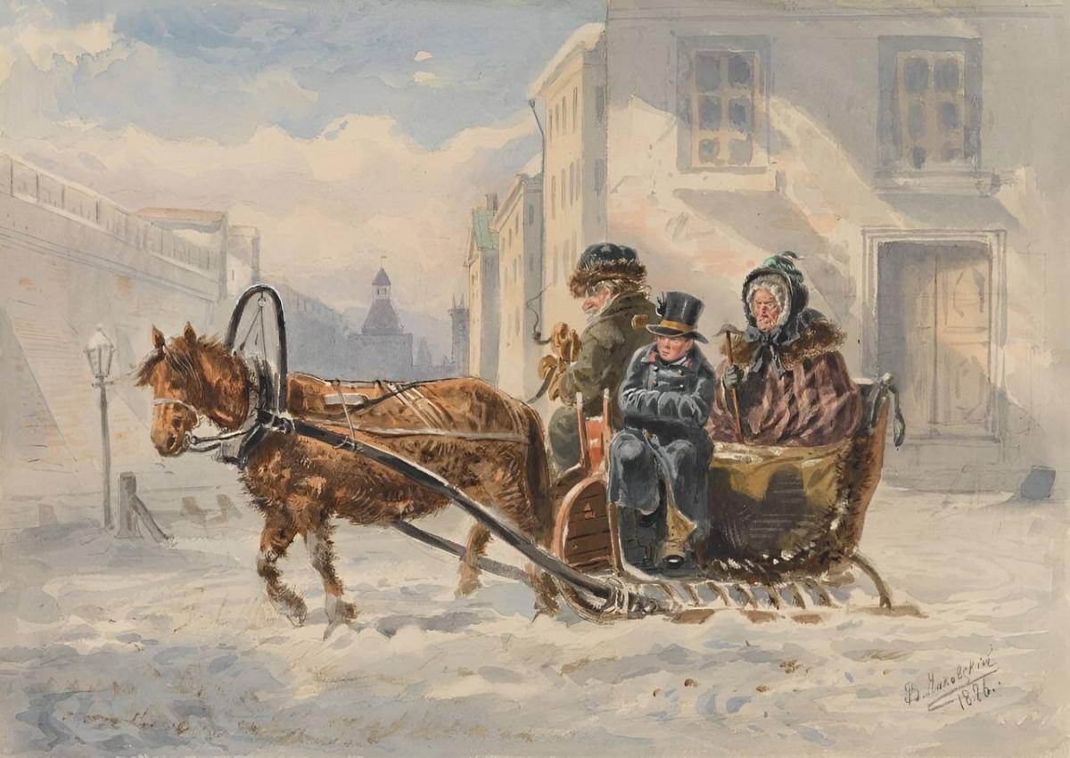 В акварели «Остатки прежнего величия» художник передает типичную ситуацию: барыня, когда-то, очевидно, обладавшая богатством и властью, обеднела. Вместо роскошного выезда – извозчик, а лакей, которому в таком экипаже нет места, пристроился сбоку. Однако пожилая дама, закутанная в клетчатый плащ, по-прежнему держит спину прямо, сохраняя гордую осанку.