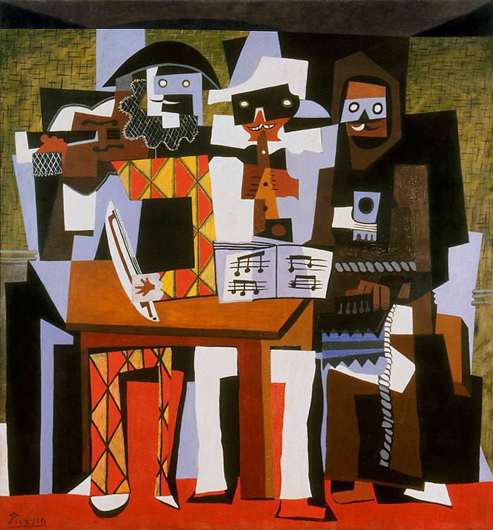 Три изображения, три индивидуальных характера, три составные части единого творческого организма. Веселый и бесшабашный Арлекин, лиричный и задумчивый Пьеро, хитрый и двуличный Монах – все они представляют собой любимых персонажей народной комедии. На картине они несмотря на то, что на сцене они всегда являются соперниками, выступают в роли друзей и музыкантов, создающих общую «мелодию» произведения, ее художественное звучание.