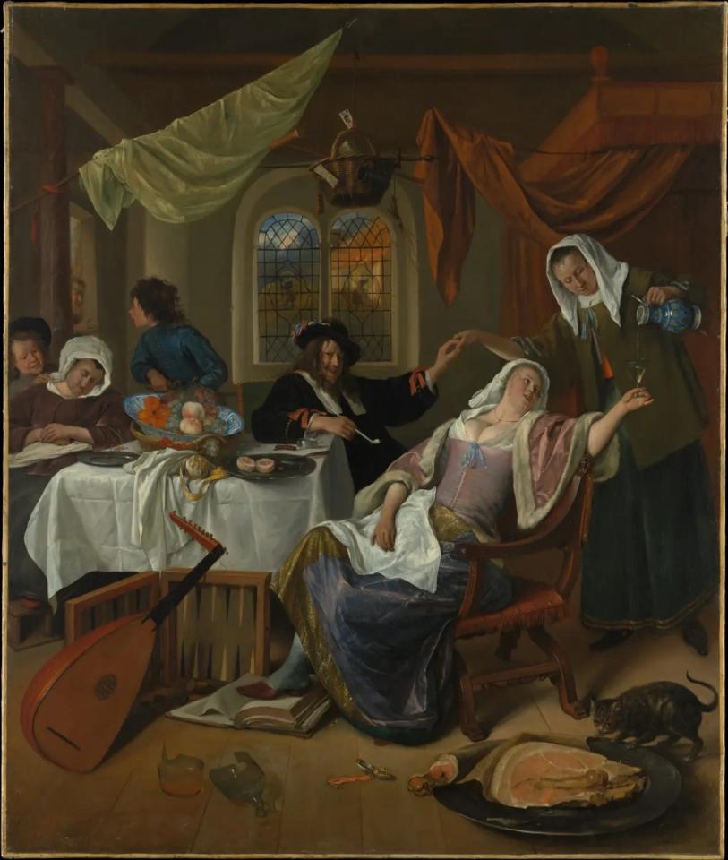 Действительно, на картине Стен изобразил лень, представленную спящей старухой; похоть в виде отца семейства, который за спиной жены держит руку служанки, пока та наливает вино хозяйке (пьянство). Разорённый стол со смятой скатертью символизирует обжорство; госпожа, попирающая Библию, воплощает кощунство; доска для нард – азартные игры; разбитая бутылка и кошка, которая готовится вцепиться в окорок на полу, – безалаберность, едва ли не самый главный грех в Голландии XVII века. Мальчик, прогоняющий попрошайку от окна, отсылает зрителя к евангельской притче о богаче и Лазаре: один, устраивая роскошные пиры, скупился даже на объедки второму, но после смерти был обречён на муки в аду, умоляя облегчить его страдания, в то время как нищий вознёсся на небеса (от Луки, 16: 19-31).