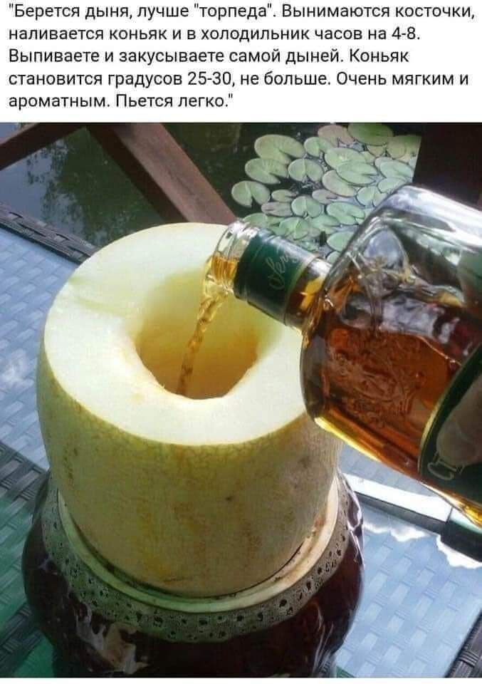 Я пробовал.И скажу вам,коллеги,что мне офигенно зашло.Вычистил половинку спелой дыни,влил туда около 250 грамм "Курвуазье".