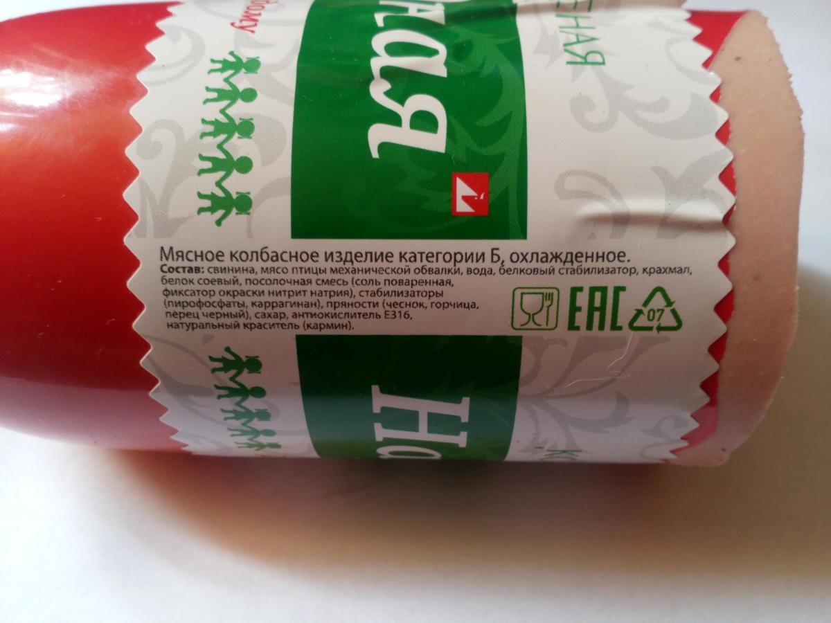 Состав: свинина,мясо птицы механической обвалки, вода, белковый стабилизатор, крахмал, белок соевый, посолочная смесь,(соль поваренная, фиксатор окраски нитрит натрия), стабилизаторы ( пирофосфаты, каррагинан), пряности (чеснок, горчица, перец черный), сахар, антиокислитель Е316, натуральный краситель (кармин)