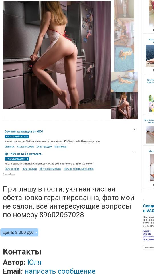 Отдыхал у этой фей в конце июля за 3т., но телефон был другой, он указан в фото анкеты. Фото на стуле и на диване точно соответстуют, а вот в переднике вроде и не она, у феи ноги тоньше, хотя кухня та же. А этот диван со спинками сразу напротив телевизора думаю узнает каждый, кто у неё отдыхал.
