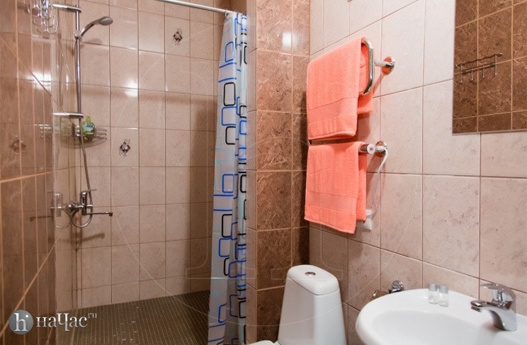 Совмещенный санузел. Душевая - кафельный стационар. Горячая вода - водогрей литров на 60(на двоих терпимо). Одноразовые гели-шампуни. Полотенца среднего размера.