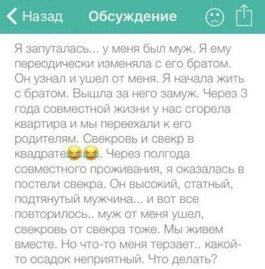 нужно было сюда ехать. А теперь требует, чтобы я вытащил на мужские половые органы имевшую секс тещу, представляешь, имел секс с твоей