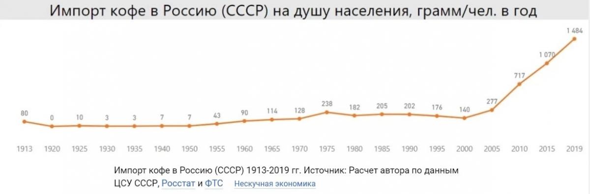2) В брежневскую эпоху потребление кофе превысило дореволюционные показатели, хотя и не кардинально. Дефицит был, но, в основном, растворимого кофе. Насколько я помню, зерновой в Ленинграде можно было купить всегда.