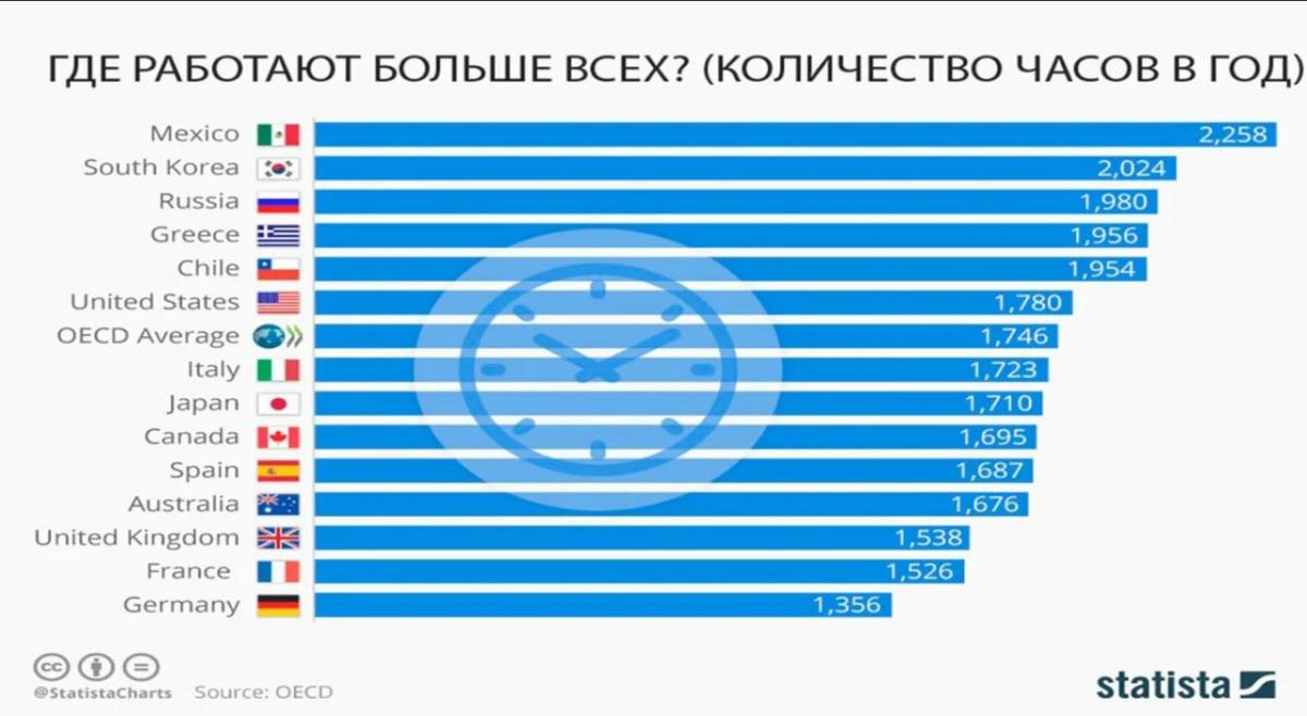 В автоперевозках, давно, по крайней мере, впереди Европы всей, по трудолюбию, понимаешь. В начале двухтысячных, немного коснулся. Не Финка, Германия, Франция, Италия. Там, масса бездельников, при должностях, строго следит, чтоб машинки - грузовички, не работали , а стояли. Проверяют "режим труда и отдыха", чтоб переработки не было, 40 часов в неделю, не более, а кое где, вроде и 35. Причем если машина , допустим стояла сутки в ожидании погрузки, а водитель передвинул ее на 15 м., все равно считается- временем работы.. С соответствующей перепланировкой графиков движения. А бывало и так, все водитель "отдохнул", переспал, уже опух от безделья, нада ехать, а вот хуюшки. На какой нибудь нимецкой Мекленбургщине, в выходной и праздничный день, движение грузовиков запрещено, охраняют покой бюргеров.