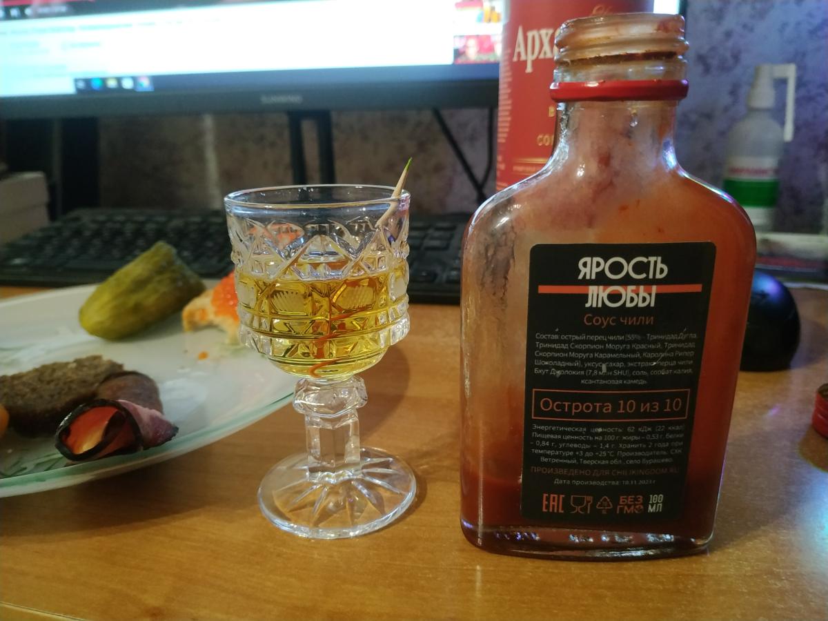 Остротой этих посредственных так называемых перцовок удовлетвориться конечно невозможно. Поэтому созрел план, - добавить острого соусца, да не в бутылку, а в рюмаху. У меня есть разные, как у любителя острого, выбран был "Ярость Любы" от известной конторы Чиликингдом. Моруга красный, Моруга карамельный, Каролина Рипер, и главное, в соус добавлен экстракт Бхут Джолокия (острота около 7 млн сковиллей)
