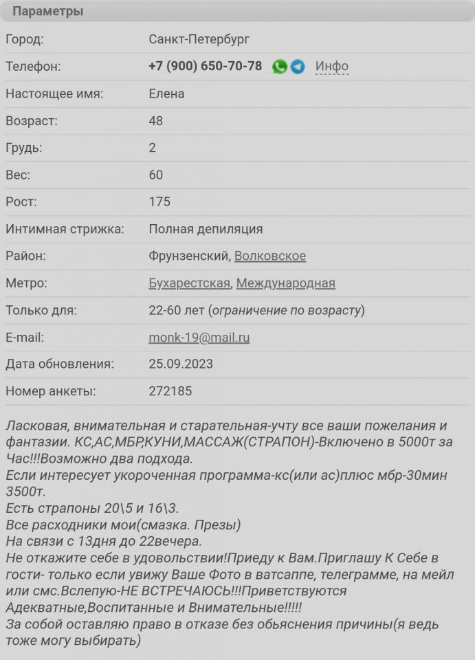 О мадам: фотки на известном сайте (русд..) в анкете 272185, по-моему, сильно приукрашивают ее внешность, в реале выглядит значительно старее, хотя в остальном фотки внешность передают хорошо. Лицо очень на любителя, грудь примерно 1,5, немного висит, жопа средняя во всех смыслах, пизда аккуратная, с пирсингом и выбрита. Cf Очень большой минус: характерный запах старости в квартире, причем даже не от самой феи, а вообще атмосфера. Это при том, что я после ковида утратил обоняние процентов на 60-70, т.е. реально всё намного хуже. Ну да ладно. К делу: сразу при входе были предложены чай/кофе (отказался) и резиновые тапки, далее ванная и потом проследовал на кровать (не скрипучая, с покрывалом, чистоту определить сложно, на вид нормальное). Кристина (или Мия?) начала делать