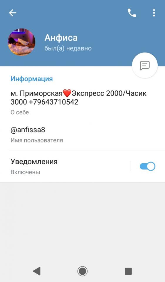 Анфиса, ТГ @anfissa8 т. 969-719-03-13; ранее м. Приморская. 964-371-05-42. Она же Ульяна, 900-637-30-92 и Алиса с кучей телефонов