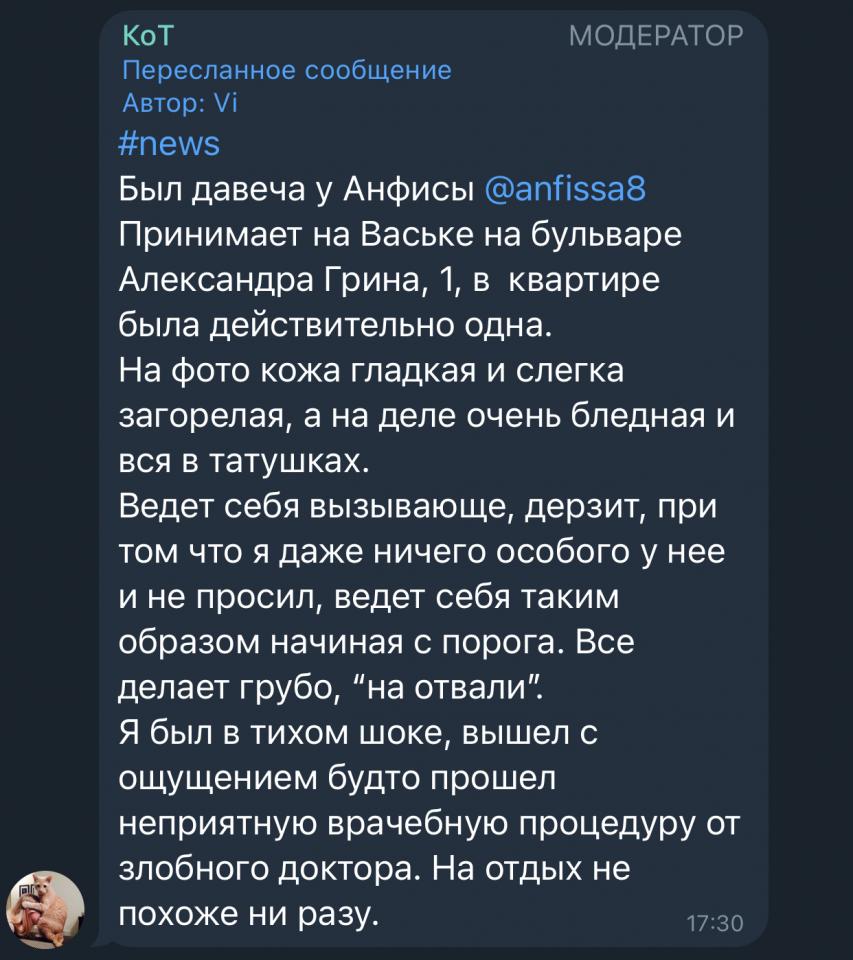 Про номер понял, но по номеру анкеты на досуге, место на фото то самое, дева совсем другая, Анфиса маленькая и хрупкая. И там адрес на Дыбенко сейчас указан, а тут Приморская.