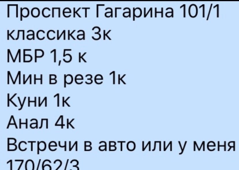 Наличие и цены допуслуг: Мин 1к, Мбр 1,5к, куни 1к , Анал 4к